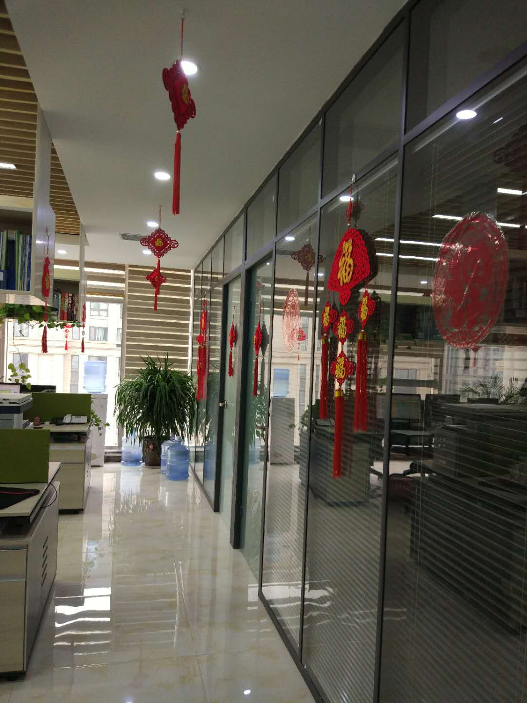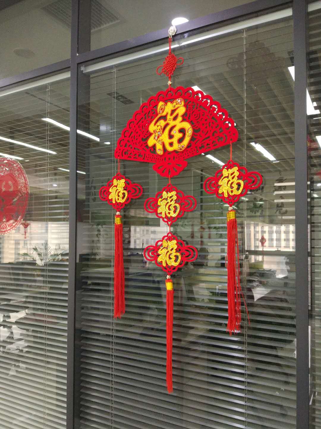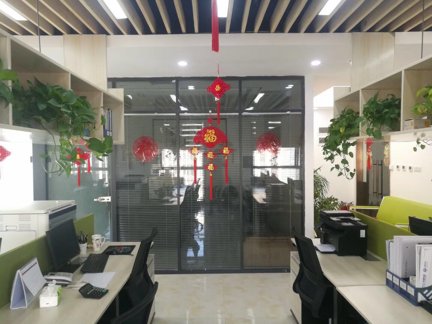 銷售部墻上和門上都分別掛上和貼上大大的“福”字,公司門口的兩盆綠植也掛滿了大紅包,辦公室內(nèi)到處一片喜氣洋洋的氣氛。